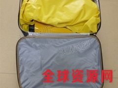 5.折叠时,将头罩开口向上铺于地面.折回头罩、颈扣带及两袖,再将服装纵折,左右重合,两靴尖朝外一侧,将手套放在中部,靴底相对卷成以卷,横向放入重型防护服包装袋内。